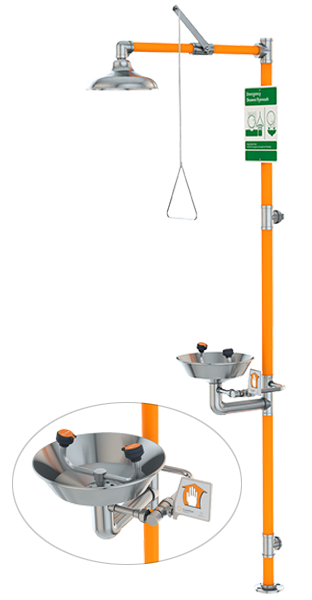 • Application: All-stainless steel combination eyewash and shower safety station. Stainless steel construction is ideal for highly corrosive environments and cleanroom applications. Eyewash features two GS-Plus™ spray-type outlet heads that deliver a flood of water for rinsing eyes.