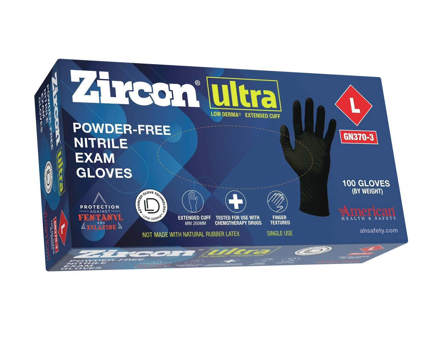 ZirconŽ Ultra Low Derma Nitrile Exam Gloves, Black, Extended Cuff, 1000/Case